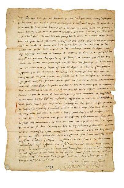 Intéressante lettre sur les négociations du mariage de Marguerite de Valois (Margot), fille de Catherine de Medicis, avec le prince de Navarre futur Henri IV, en vue de réconcilier les Catholiques et les Protestants [le mariage eut lieu en août 1572].