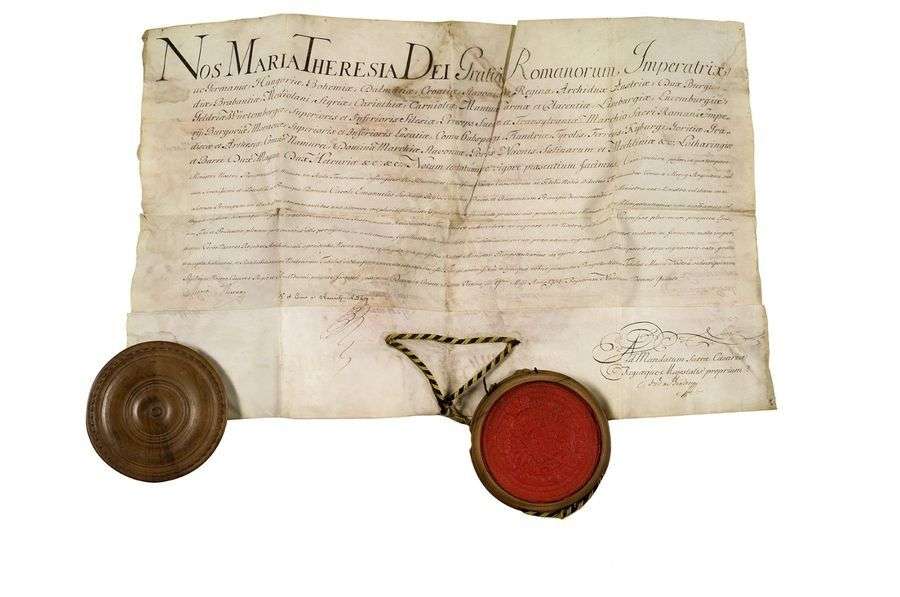 P.S. «Maria Theresia», Vienne 17 mai 1754| contresignée par le comte de KAUNITZ-RITTBERG et Frédéric de BINDER| vélin in plano (54 x 67 cm.), grand sceau pendant de cire rouge aux armes dans son boîtier en bois tourné, sur cordons jaune et noir| en latin (légères mouillures).