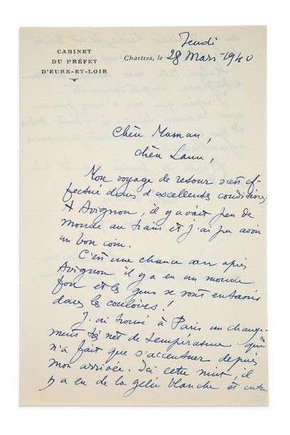 L.A.S. «Jean», Chartres jeudi 28 mars 1940, à sa mère Mme Antoine-Émile MOULIN et sa soeur Laure MOULIN | 2 pages in-8 à en-tête du Cabinet du préfet d'Eure-et-Loir.