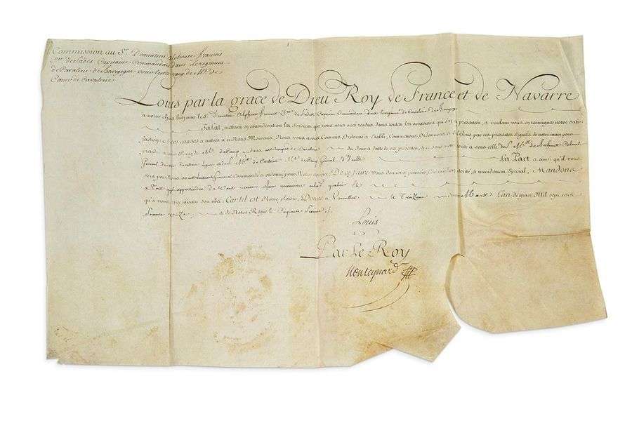 Le Roi nomme le comte de SADE, alors «Capitaine Commandant dans le regiment de Cavalerie de Bourgogne», au rang de maître de camp «dans nos troupes de cavalerie [...] sous notre autorité et sous celle du S. Mis de Bethunes Colonel General de notre Cavalerie legere et du S. Mal de Castries Me de Camp General d'icelle»... [Entré à l'école des Chevau-légers en 1754, Sade fut nommé sous-lieutenant au régiment du Roi-infanterie en 1755, puis cornette au régiment des Carabiniers du comte de Provence en 1757, capitaine au régiment de Bourgogne-cavalerie en 1759 | engagé sur cette période dans la guerre de Sept ans, il fit montre d'une certaine bravoure.
