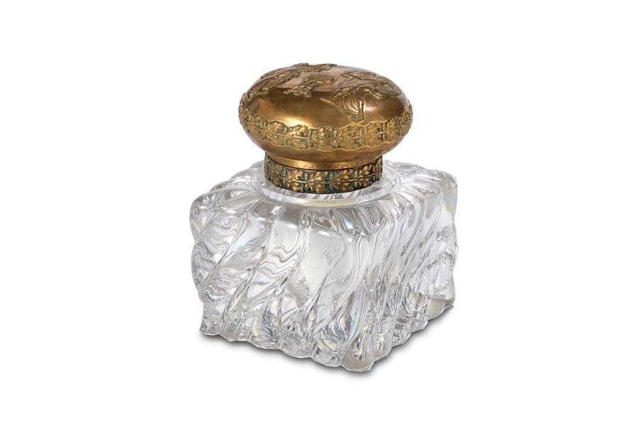 En verre à torsades | cabochon en laiton décoré en relief de frises de feuilles de chêne, et au sommet d'allégories antiques représentant la Guerre tenant des flèches dans la main et la Paix tentant d'éteindre un feu. Hauteur : 13 cm, largeur 9,5cm (un éclat à l'un des angles inférieurs du verre).
