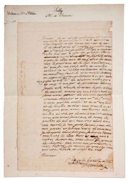 L.A.S. «Le Duc de Sully» (minute), à M. de CHASERON| 1 page grand in-fol. avec note autographe au dos «Lettre de Mr de Chaseron et ma responce» (montage à fenêtre).