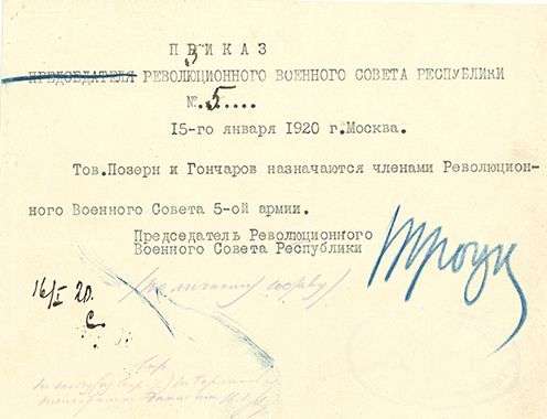 Nomination des commissaires Posern et Goucharov au Soviet révolutionnaire de la 5e Armée, à Moscou le 15 janvier 1920.