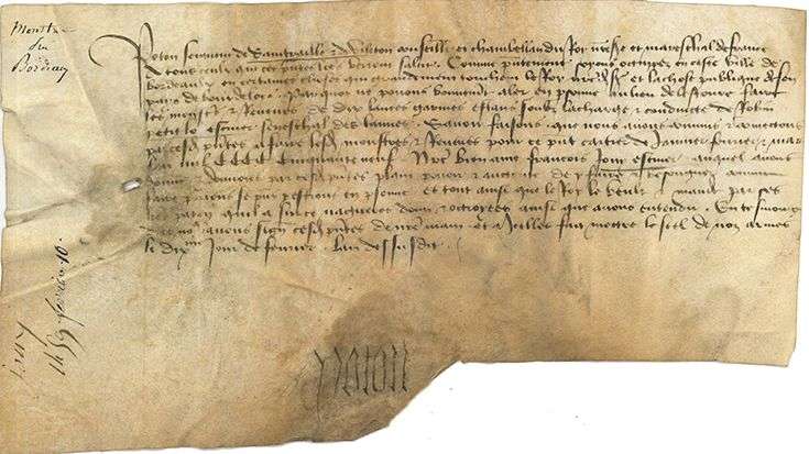 «Poton seigneur de Saintraille et de Vileton conseiller et chambellan du Roy nre Sire et mareschal de France [...] Comme presentement soyons occuppez en ceste ville de Bordeaulx en certaines choses qui grandement touchent le Roy nostre dit Seigneur et la chose publique de son pays de Bourdeloys par quoy ne povons bonnement aller en personne au lieu de Lestoure faire les monstres et revues de dix lances garnies estans soubz la charge et conduicte de Robin Petitlo escuier seneschal des lances», il délègue pour «faire lesd. monstres et reveues» François Jouy écuyer...