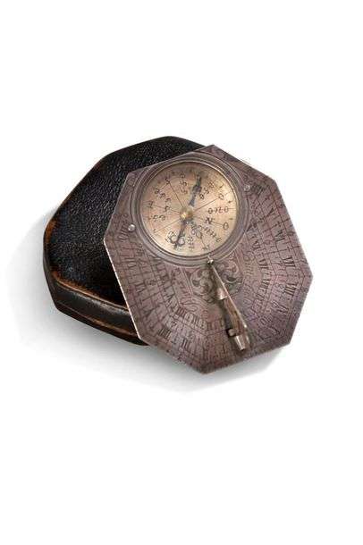 + CADRAN SOLAIRE EN ARGENT DE TYPE BUTTERFIELD (1635-1724) la platine de dorme octogonale avec une boussole, gnomon rabattable gravé d'un oiseau. Au revers, les latitudes de 26 villes européennes.