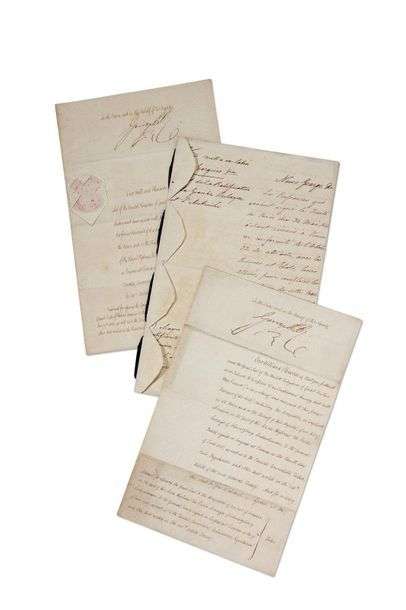 + 2 P.S. «George PR» (en tête), Palace of Carlton House [Londres] 11 avril et 16 décembre 1816 | contresignées par le secrétaire d'État au Foreign Office, le vicomte