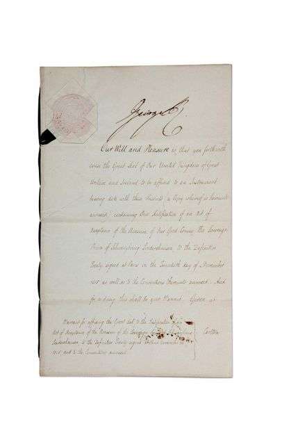 Palace 31 décembre 1820 | contresignée par le secrétaire d'État au Foreign Office, le vicomte CASTLEREAGH | cahier in-fol. de 6 pages lié d'un ruban de soie bleue, sceau aux armes sous papier en tête | en anglais.