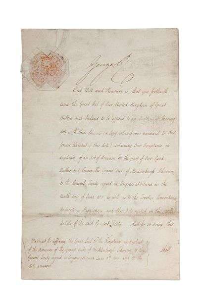 Mandat du Roi pour mettre le Grand Sceau du Royaume Uni de Grande-Bretagne et Irlande à son acceptation de l'acte d'adhésion du Grand-Duc de MECKLENBURG-SCHWERIN au Traité général signé au Congrès de Vienne le 9 juin 1815, aussi bien qu'aux traités, conventions, déclarations, règlements et autres actes précisés dans le 118e article dudit traité général...