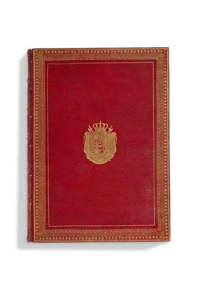 in folio, maroquin rouge à long grain, large bordure à décor de croisillons, armoiries au centre des plats, dos orné à décor de palmes sur fond pointillé, roulette intérieure, doublure et gardes de tabis bleu avec roulette à décor de pampres, tranches dorées, étui moderne à dos demi-maroquin rouge.