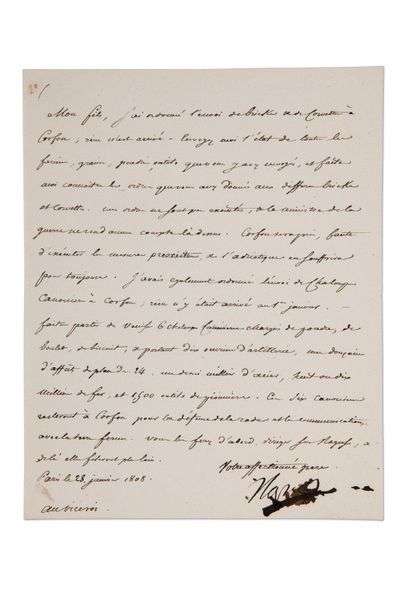 [Cédé à la France par la Russie, lors de la paix de Tilsit (1807), l'archipel des Îles Ioniennes, dont Corfou, sous le nom de République des SeptÎles, avait vu débarquer des troupes franco-italiennes en août 1808.] «Mon fils, j'ai ordonné l'envoi de bricks & de la corvette à Corfou | rien n'est arrivé. Envoyez moi l'état de toutes les farines, grains, poudre, outils que vous y avez envoyés, et faites moi connaître les ordres que vous avez donnés aux differens bricks et corvettes. Mes ordres ne sont pas exécutés, & le ministre de la guerre ne rend aucun compte là-dessus. Corfou sera pris, faute d'exécuter les mesures prescrites, & l'Adriatique en souffrira pour toujours. J'avais egalement ordonné l'envoi de chaloupes canonieres à Corfou | rien n'y était arrivé au 1er janvier. - Faites partir de Venise 6 chaloupes canonieres chargées de poudre, de boulet, de biscuit, & portant dix ouvriers d'artillerie, une douzaine d'affûts de place de 24, un demi millier d'acier, huit ou dix milliers de fer, et 1,500 outils de pionniers. Ces six canonieres resteront à Corfou pour la défendre de la rade et la communication avec la terre ferme. Vous les ferez d'abord diriger sur Raguse, & de là elles fileront plus loin»...