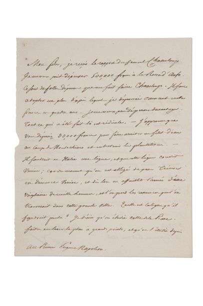 Napoléon», Eugène de BEAUHARNAIS, Vice-Roi d'Italie | la lettre est écrite par MÉNEVAL | 2 pages in-4.