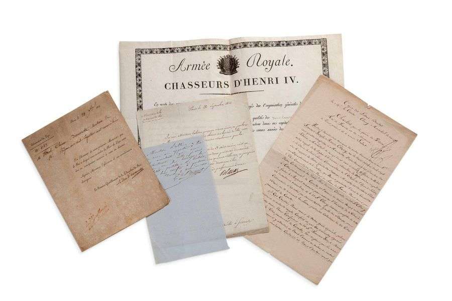 Casimir de Blacas (ministre de la Maison du Roi, 1814), Achille comte de Breteuil, Laudine de Saint-Esprit (brevet de sous-lieutenant dans les Chasseurs d'Henri IV, 1815), plus une copie certifiée conforme d'époque des lettres patentes accordant à François Clary le titre de comte (1829).
