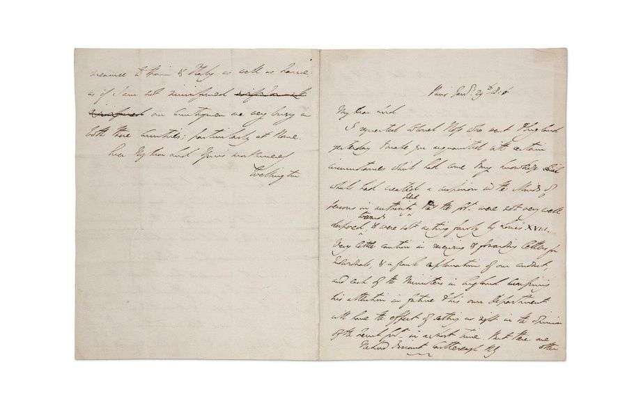 + L.A.S. «Wellington», Paris 29 janvier 1816, au vicomte CASTLEREAGH (secrétaire d'État aux Affaires étrangères du Royaume Uni) | 3 pages et demie in-4 | en anglais.
