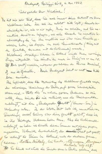 Sur l’organisation de concerts de ses œuvres en Allemagne . [Fritz WINDISCH, ex-rédacteur de la revue allemande Melos pour la musique moderne, organisait aussi des concerts en Allemagne. Il est notamment question du violoniste hongrois Imre WALDBAUER (1892-1952), violoniste, fondateur du Quatuor Hongrois qui créa les quatre premiers Quatuors de Bartók.]