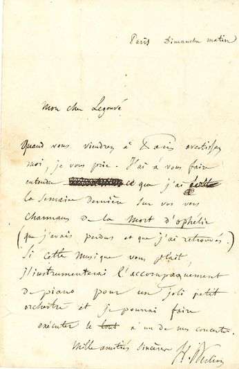 « Quand vous viendrez à Paris avertissez-moi, je vous prie. J’ai à vous faire entendre ce que j’ai écrit la semaine dernière sur vos vers charmans de la Mort d’Ophélie (que j’avais perdus et que j’ai retrouvés.) Si cette musique vous plaît, j’instrumenterai l’accompagnement de piano pour un joli petit orchestre et je pourrai faire exécuter le tout à un de mes concerts »… Correspondance, t. VIII, n° 769 bis.