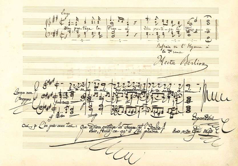 MANUSCRIT MUSICAL autographe signé « Hector Berlioz », Refrain de l’Hymne de la France, [1845] | demi-page d’un feuillet oblong in-4 (23 x 30 cm).