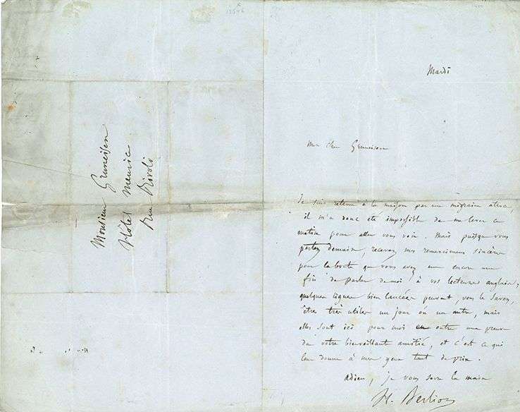 L.A.S. « H. Berlioz », Mardi [23 janvier 1849 ?], à Charles GRUNEISEN, à l’Hôtel Meurice | 1 page in-8, adresse (un peu salie au pli central, légères fentes au f. d’adresse).