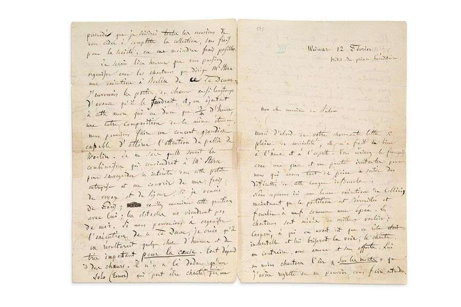 L.A.S. « H. Berlioz », Weimar 12 février [1856], à Hans von BÜLOW | 5 pages in-8 remplies d’une petite écriture serrée (fentes aux plis et réparations, le bas du dernier feuillet un peu eff rangé avec petit manque à la fi n de la signature).