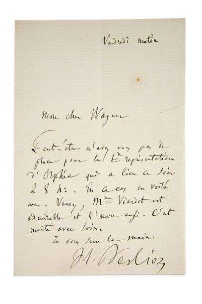 « Mon cher Wagner Peut-être n’avez-vous pas de place pour la 1re représentation d’Orphée qui a lieu ce soir à 8 h. En ce cas en voilà une. Venez, Mme Viardot est admirable et l’œuvre aussi. C’est monté avec soin. Je vous serre la main »...