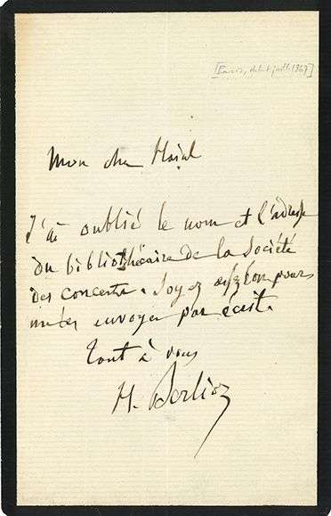 « J’ai oublié le nom et l’adresse du bibliothécaire de la Société des Concerts. Soyez assez bon pour me les envoyer par écrit »... [Berlioz avait perdu son fi ls unique Louis le 29 juin 1867.]