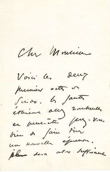 « Voici les deux premiers actes de Guido [Guido et Ginevra, opéra du beau-père de Bizet, Fromental HALÉVY, dont l’édition posthume parut chez Lemoine en 1870]. Les fautes étaient assez nombreuses et peut-être ferez-vous bien de faire tirer une nouvelle épreuve. Il sera alors suffisant de composer cette nouvelle épreuve avec celles que je vous renvoie, car je suis sûr de n’avoir laissé aucune erreur sérieuse. Je vais faire tout mon possible pour vous rendre rapidement la fin de la partition »…