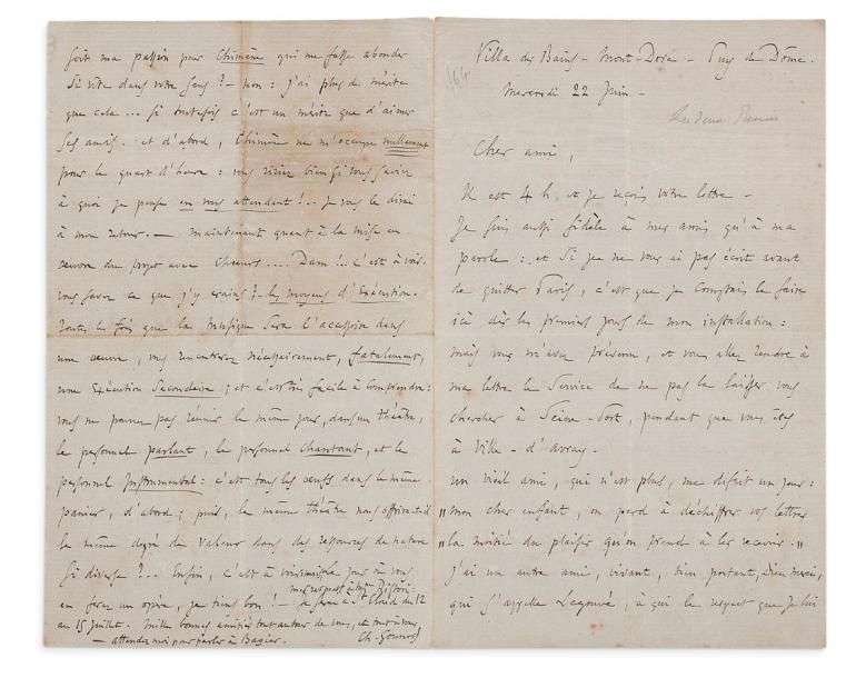 Gounod est venu en Auvergne pour soigner une entorse au pied, et a dû renoncer à la fête des Saintes-Maries-de-la-Mer, à un voyage à Londres : « Enfi n, je traîne un boulet ». Quant à leur projet, il en a parlé à Barbier qui « a renoncé à toute espèce de collaboration et ne veut plus travailler, soit pour lui soit pour un musicien, que seul, absolument seul », et qui refuse donc de travailler pour Legouvé | Gounod rapporte ses propos : « je veux mon Gounod à moi tout seul : je l’aime, j’en suis jaloux, et je ne veux le partager avec personne ». Il commente : « Je suis très fi er de provoquer de pareilles passions, surtout chez un homme comme Barbier que j’aime de tout mon cœur et dont toute la nature m’est particulièrement chère et sympathique ». Il a donc demandé l’aide de Michel Carré et attend sa réponse : « OUI, il faut faire ce que vous dites et ce que pense Mme RISTORI », et il souhaite contribuer à la gloire de cette admirable pièce. Pour l’instant, il ne s’occupe nullement de Chimène… Quant aux chœurs, « vous savez ce que j’y crains ? – les moyens d’exécution. Toutes les fois que la musique sera l’accessoire dans une œuvre, vous rencontrez nécessairement, fatalement, une exécution secondaire | et c’est très facile à comprendre : vous ne pourrez pas réunir le même jour, dans un théâtre, le personnel parlant, le personnel chantant, et le personnel instrumental : c’est tous les œufs dans le même panier, d’abord | puis, le même théâtre nous off rira-t-il le même degré de valeur dans des ressources de nature si diverse ?... Enfi n, c’est à voir : mais, le jour où vous en ferez un opéra, je tiens bon ! »…
