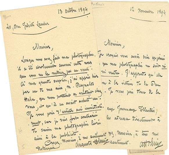 Au photographe Wilhelm BENQUE. [22 octobre 1892] : « Je ne puis pas venir aujourd’hui pour mon portrait, malgré ce radieux soleil ! J’ai un travail indispensable à faire, et je suis enchaînée à ma table »… 13 octobre 1894 : « À ma grande surprise, j’ai appris hier par un de mes amis, M. Reynaldo HAHN, que mon portrait se vendait chez vous, et qu’il en avait acheté un. Je vous prie d’arrêter ceci immédiatement, car je suis fort contrariée »… 12 novembre 1894, rappelant son vœu que sa « photographie ne soit ni exposée ni vendue »… 25 mars 1895, demandant les photographies de ses artistes « dans leurs costumes de La Montagne-noire », dans différentes poses, ainsi qu’un certain nombre de ses photographies de profil : « Celles qui ont une cravate de mousseline »… 29 mars 1895, remerciant, souhaitant des portraits plus petits « pour envoyer à ma famille en Irlande » | envoi de fauteuils pour un concert de charité : « On ne joue que le Finale de l’Ode (apparition de la République.) Mme Héglon est superbe »…