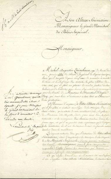 Le maréchal NEY appuie la requête, par une apostille marginale : « Je m’intéresse beaucoup à Mr Quinebaux, qui est très recommandable à tous égards »…