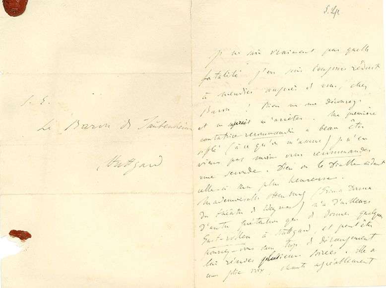 L.A.S. « F. Liszt », Berlin 6 mars [1842 ?], à S.E. le baron Wilhelm-August von TAUBENHEIM, à Stuttgart | 2 pages in-8, adresse avec cachet de cire rouge aux armes couronnées (brisé).