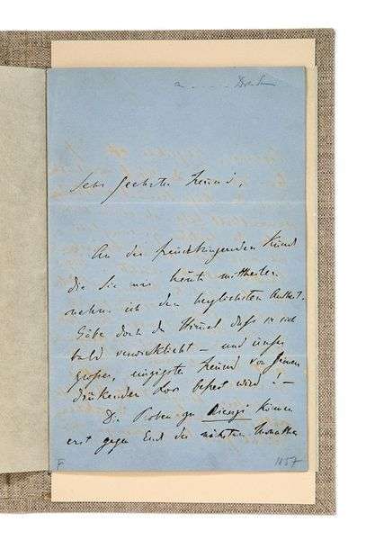 L.A.S. « F. Liszt », Weimar 11 décembre 1857, à un ami [Carl Gottlieb REISSIGER] | 4 pages in-8 sur papier bleu | montée sous chemise de toile beige avec portraits gravés de Liszt et de Wagner sur les contreplats, emboîtage demi-maroquin brun titré au dos | en allemand.
