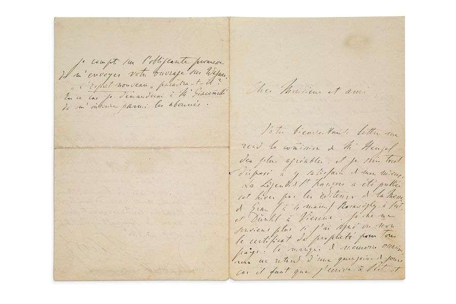 La bienveillante lettre de Gasperini lui rend la commission de M. HEUGEL des plus agréables : « La Légende de St François a été publiée cet hiver par les éditeurs de la Messe de Gran (à 4 mains) Rosavögly à Pest, et Dünkl à Vienne. Je ne me souviens plus si j’ai signé ou non le certifi cat de propriété pour tous pays »… Il se renseignera rapidement, et se plaît à croire que cette petite aff aire s’arrangera sans diffi culté. « Le fait est que j’avais renoncé depuis longtemps à m’occuper de la publication de mes œuvres en France, trouvant que les habitudes de savoir-vivre de tels ou tels éditeurs de Paris ne concordaient pas avec les miennes. Ce qu’on a réimprimé de moi à Paris ces quinze dernières années a été publié à mon insu, tout au hazard | et mes relations de ce genre se bornent exclusivement à quelques éditeurs allemands à la louange desquels je dirai que leurs procédés à mon égard n’ont jamais eu rien de tudesque ni d’équivoque. Grâce à vous, cher Monsieur, le trajet du détroit de Messine de St François pourra aboutir… à la rue Vivienne »… Il remercie de « l’obligeante promesse de m’envoyer votre ouvrage sur WAGNER » et demande quand va paraître L’Esprit nouveau…