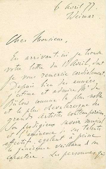 L.A.S. « F. Liszt », Weimar 6 avril 1877 | 1 page et demie in-8.