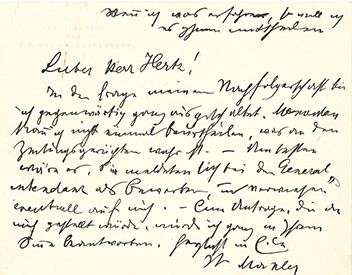 « In der Frage meiner Nachfolgeschaft bin ich gegenwartig ganz ausgeschaltet. Momentan kann ich nicht einmal beurtheilen, was an den Zeitungsgerüchten wahr ist. - Am besten ware es, Sie meldeten sich bei dem Generalintendant als Bewerber, und verweisen eventuell auf mich. - Eine Anfrage, die an mich gestellt würde, würde ich ganz in Ihrem Sinne beantworten [...] Wenn ich was erfahre, so will ich es Ihnen mittheilen »…