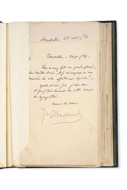 39 L.A.S. « J. Massenet », « M. Massenet » ou « Massenet », 1876-1896, la plupart à Gaston KNOSP | 79 pages in-8 ou in-12, la plupart avec enveloppe, montées sur onglets, reliure maroquin bleu, dos à nerfs orné de caissons aux fl eurons, triples fi lets dorés d’encadrement sur les plats, large cadre intérieur de maroquin à 4 fi lets dorés et ornements, doublures et gardes de soie moirée rouge, étui (David). Belle correspondance à un ancien élève, compositeur et ethnomusicologue.