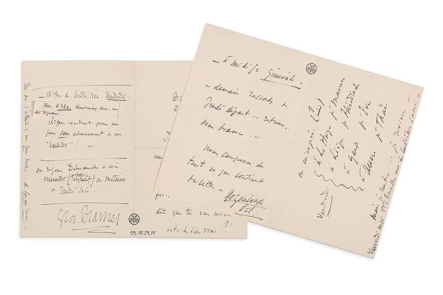 29 octobre. Il est heureux de recevoir de meilleures nouvelles : « Ah ! tu as été grippée fortement »… Il confi rme un rendez-vous avec Alphonse Labitte. « Bruxelles est dans le brouillard humide et chaud… C’est malsain mais je suis prudent. Heugel arrive demain soir à Bruxelles »… La première étant annoncée pour vendredi 3 novembre, il pense être à Paris mercredi ou jeudi. Il donne ensuite les résultats des rentrées du vendredi [pour Thaïs], « chiff re excellent pour un jour sans abonnement et un vendredi ! », et les dates des prochaines représentations. Il ajoute : « Ici on s’attend à un gros succès »… 31 octobre. « Tu vas mieux – j’ai de la joie !! […] À midi ½ Générale – demain raccords et jeudi départ...retour… ». Il est espéré vendredi en plusieurs endroits : à la Haye pour Manon, à Liège pour Hérodiade, à Gand pour Eve, à Anvers pour Thaïs !