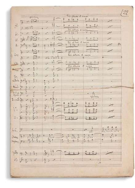 6 pages grand in-fol. (déchirées par le milieu puis recollées, 22-25, 27-28) : fragment de l’orchestration de Kassya de Léo Delibes sur partie vocale préparée : le Comte, chœur et paysans (acte IV, scène 2). Plus 3 grands feuillets, dont 2 pages avec orchestre, et 2 pages corrigées d’une mélodie.