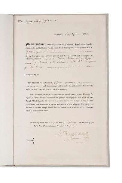 Contrat de vente à l’éditeur musical Joseph Alfred NOVELLO de « my Psalm When Israel out of Egypt came, for 8 voices and orchestra with the arrangement of the same », pour la somme de 15 guinées.