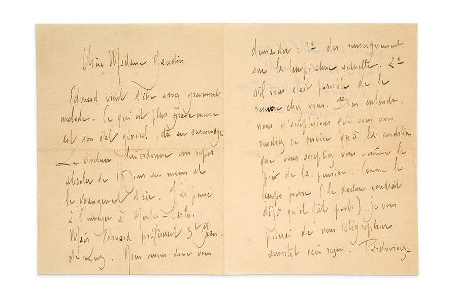 Son frère « Édouard vient d’être assez gravement malade. Ce qui est plus grave encore est son état général, dû au surmenage. Le docteur lui ordonne un repos absolu de 15 jours au moins et le changement d’air. J’ai pensé à l’envoyer à Monte-Carlo. Mais Édouard préférerait St -Jean-de-Luz. Nous venons donc vous demander : 1° des renseignements sur la température actuelle. 2° s’il vous était possible de le recevoir chez vous […] à la condition que vous acceptiez vousmême le prix de la pension. Comme le temps presse (le docteur voudrait déjà qu’il fût parti), je vous prierai de nous télégraphier aussitôt ceci reçu »…