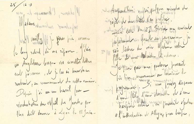 Il a tardé à répondre | il était en Angleterre, et est rentré « au commencement de cette semaine. Depuis j’ai eu un travail fou – réorchestration du Noël des Jouets que l’on doit donner à Lyon le 11 janvier. […] La date du 27 Février me convient parfaitement. Quant au programme, je vais tacher de voir Madame votre fi lle et nous entendre là-dessus. Je pense que mon Quatuor pourrait très bien commencer ou terminer le programme. Si vous pouvez disposer d’une fl ûte, d’une clarinette et d’une harpiste soliste, on pourrait ajouter l’Introduction et Allegro pour harpe, quatuor et ces deux instruments à vent. Comme ensemble vocal, je ne vois que le fi nale de L’Heure espagnole (4 voix d’hommes, 1 voix de femme) »...