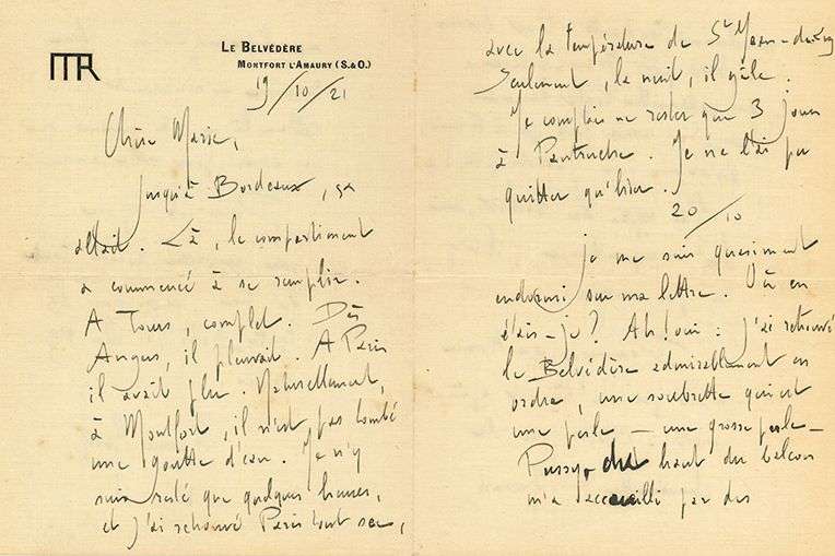 L.A.S. « Maurice Ravel », Le Belvédère, Montfort l’Amaury 19-20 octobre 1921, [à son amie basque Marie GAUDIN] | 4 pages in-8 à son monogramme et à son adresse.