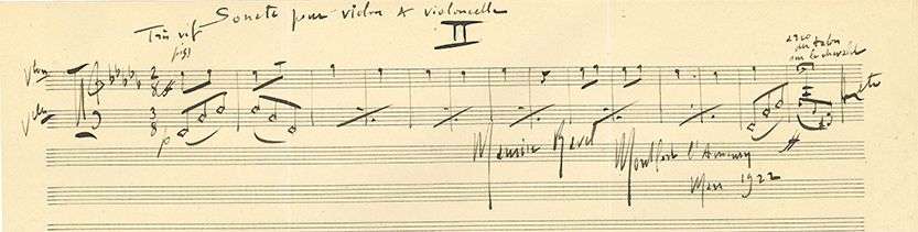 Belle page d’album donnant les 14 premières mesures du 2e mouvement de la Sonate pour violon et violoncelle, marquée « Très vif » à 2/8, signée et datée « Montfort l’Amaury Mars 1922 ».
