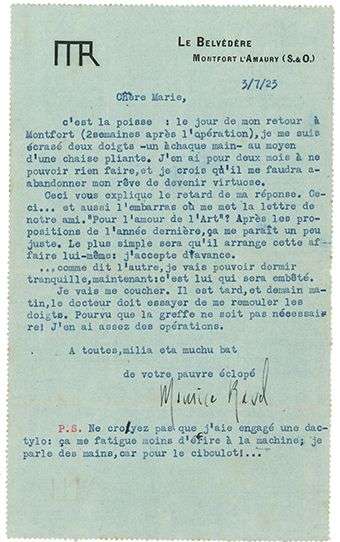 J’en ai pour deux mois à ne pouvoir rien faire, et je crois qu’il me faudra abandonner mon rêve de devenir virtuose. […] demain matin, le docteur doit essayer de me remouler les doigts. Pourvu que la greffe ne soit pas nécessaire. J’en ai assez des opérations. […] Ne croyez pas que j’aie engagé une dactylo : ça me fatigue moins d’écrire à la machine | je parle des mains, car pour le ciboulot !... »