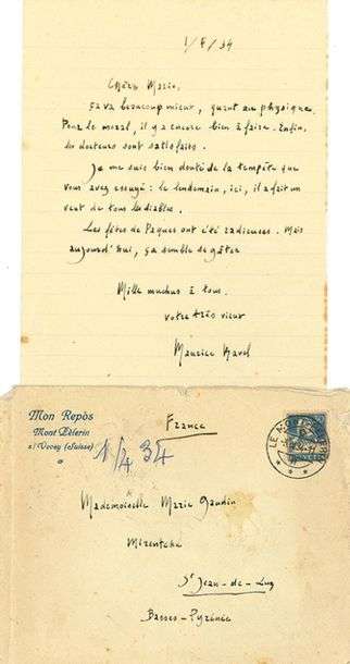 L.A.S. « Maurice Ravel », [Mont Pèlerin sous Vevey] 1er avril 1934, à son amie Marie GAUDIN à Saint-Jean-de-Luz | 1 page in-8, enveloppe à en-tête de la clinique Mon Repos.