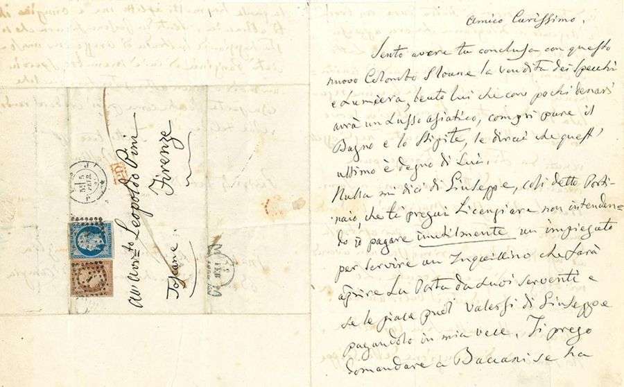 Il pense que Pini a terminé la vente des miroirs et des lustres au nouveau Colombo Slaone, qui aura acquis à peu de frais un luxe asiatique, avec la salle de bains et les huisseries (« Sento avere tu conclusa con questo nuovo Colombo Sloane la vendita dei specchi e lumiera, bento lui chi con pochi denari avrà un lusso asiatico, compri pure il bagno e lo stipite, le dirai che quest’ultimo è degno di lui »). Il faut licencier le soi-disant concierge Giuseppe, qu’il est inutile de payer inutilement. Il prie Pini de demander à Baccani s’il a vu une couronne de pierres dures avec croix d’argent en filigrane qui pendait à un crochet dans la chambre à coucher d’Olimpia avec une palme offerte par le défut et bon archevêque (« una corona di pietre dure con croce d’argento in filograna che era appesa ad’un crochet nella camera da letto d’Olimpia [...] unitamente ad’una palma che le venne regalata dal defunto e buon Arcivescovo ») | ils ne l’ont pas retrouvée parmi les objets venus de Florence. Il faut aussi charger Baccani de débarrasser la remise ou magasins, et de la vendre à usage de boutique ou de remise. La grippe l’a frappé, ainsi qu’Olimpia, mais elle va diminuant… Il évoque pour finir une négociation concernant la rue d’Arezzo avec une société parisienne…