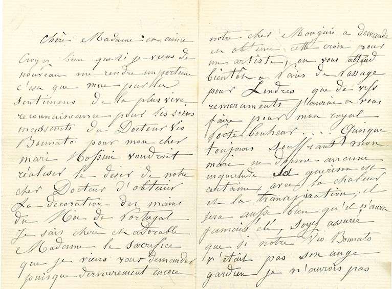 Mû par « la plus vive reconnaissance pour les soins incessants du Docteur Vio Bonnato pour mon cher mari Rossini voudroit réaliser le désir de notre cher Docteur d’obtenir la décoration des mains du Roi de Portugal. Je sais chère et adorable Madame le sacrifice que je viens vous demander puisque dernièrement encore notre cher MONGINI a demandé et obtenu cette croix pour un artiste […] Quoique toujours souffrant mon mari ne donne aucune inquiétude sa guérison est certaine, avec la chaleur et la transpiration | il sera aussi bien qu’il n’aura jamais été »… Vio-Bonato est son ange gardien… – Rossini prend la plume pour se rappeler à son souvenir et à celui de son très cher mari, et exprimer le vœu que S.M. lui accorde la grâce de donner au médecin qui a prodigué ses soins, un cadeau qui ne sera pas indigne de lui…