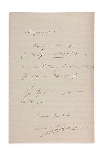 « Il m’a été impossible d’écrire le Concerto projeté. Je puis vous jouer à la place mon concerto en Ré [n° 1, op. 17] qui n’a jamais été joué en Angleterre, ou n’importe quel concerto que vous me désignerez. Voulez-vous que je dirige Phaëton, ou ma Suite (Prélude, Sarabande, Gavotte et Final) ? Je ferai ce que vous voudrez »… [Wilhelm GANZ (1833-1914), musicien d’origine allemande, installé en Angleterre, y dirigeait le New Philharmonic Orchestra | il fit venir Saint-Saëns pour la première fois en Angleterre.]