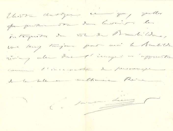 [Début aout 1894 ?], à un confrère : « La belle Mlle BRÉVAL qui doit chanter un morceau de ma façon [Pallas-Athèné] au Théâtre d’Orange ira sur mon conseil vous demander des indications pour son costume »… 19 décembre 1895, à Lucienne BRÉVAL : « Je n’ose aller vous voir, ne sachant si ma vue vous serait agréable ou pénible, mais je tiens à vous dire que vous êtes toujours pour moi la belle muse du théâtre classique et que, quelles que puissent être dans l’avenir les interprètes du rôle de Brunhilde, vous serez toujours pour moi la Brunhilde rêvée, celle dont l’image m’apparaîtra comme l’incarnation du personnage de la belle et malheureuse Reine »… Avignon 189-, au sujet des répétitions à Orange… Mardi, à une demoiselle : « j’aurai l’honneur de vous soumettre le morceau que j’ai essayé d’écrire aujourd’hui à votre intention »… Plus un billet a.s.