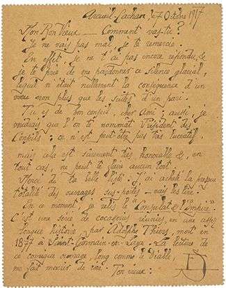 Il le prie de pardonner son silence glacial, « nullement la conséquence d’un vœu non plus que les suites d’un pari. Tu es de bon conseil, cher ami | aussi, je voudrais que l’on te nommât Président des Conseils : ce n’est peut-être pas très lucratif, mais cela est sûrement très honorable &, en tout cas, ne peut te faire aucun tort. Merci de ta belle liste. J’ai acheté la presque totalité des ouvrages sus-portés – vais les lire. En ce moment je relis le Consulat & l’Empire. C’est une série de cocasseries réunies, en une assez longue historie, par Adolphe THIERS, mort en 1877 à Saint-Germain-en-Laye. La lecture de ce comique ouvrage, long comme le Diable, me fait mourir de rire »…