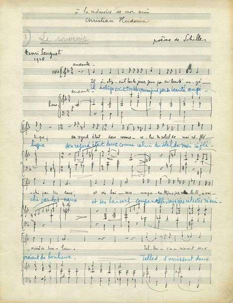Ensemble complet des Quatre Mélodies sur des poèmes de Schiller, pour voix et piano. Les poèmes de Friedrich SCHILLER sont traduits en français. Les manuscrits sont notés à l’encre noire sur papier à 20 lignes. Sous les paroles écrites par Sauguet, un chanteur (ou une chanteuse ?) les a recopiées d’une grande écriture à l’encre bleue, pour les rendre plus lisibles afin de les chanter