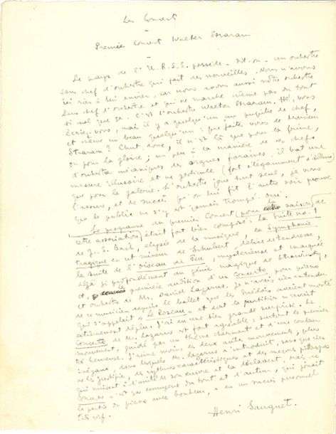 MANUSCRIT autographe signé « Henri Sauguet », Les Concerts. Premier concert Walter Straram, avec L.A.S. d’envoi « H.S. », Toulouse 25 janvier 1929, à Jacques BENOISTMÉCHIN | 1 et 2 pages in-4.